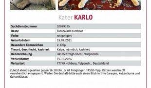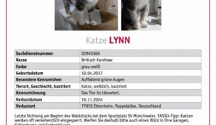 ansehenKatze Lynn wird seit dem 16.11.2024 in Münchweier vermisst. Zuletzt wurde sie in der Nähe des Sportplatzes gesehen. Sie ist kastriert und hat ein Tattoo. Wer Lynn gesehen oder gesichert hat, darf sich mit ihren Haltern in Verbindung setzen. Tel.: +49 [...]
