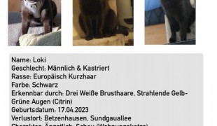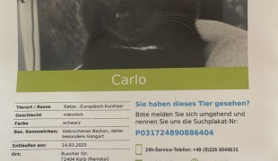 ansehenKater Diego ist ein schwarzer Kater mit einem weißen Punkt auf der Brust. Zuletzt wurde er am Dienstagmorgen 26.11. gegen 11 Uhr gesichtet. Entlaufen ist er von der Amtmann-Stein Straße bzw. im Raum des Klinikums in Lahr. Diego ist kastriert, in [...]