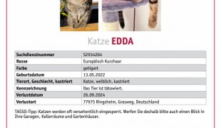ansehenText der Halter: Katze "Edda" wird seit dem 26.09.2024 im Bereich des "Grasweg" in Ringsheim, vermisst. Edda ist eine 2.5 Jahre alte kastrierte Freigängerin. Sie ist in beiden Ohren tätowiert, registriert und bereits bei Tasso als vermisst gemeldet. ❗️Vom Wesen [...]
