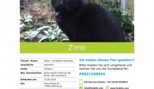 Kater Zimti wird seit vier Jahren in Offenburg vermisst. Der kastrierte Kater ist leider nicht gekennzeichnet, was die Suche natürlich erschwert. Zimti müsste nun etwa 13 Jahre alt sein. Sein Fell schimmert am Bauch unten je nach Jahreszeit bräunlich. Am [...]