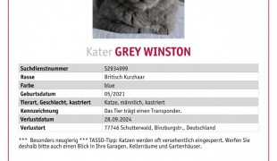 ansehenKater Winston wird in Schutterwald vermisst. Wer ihn gesehen hat oder sichern konnte, darf sich mit seinen Haltern in Verbindung setzen. E-mail Adresse: ycorbe189@gmail.com Handynummer: 017670614331