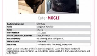 ansehenMogli ist ein schwarzer Kater, 6 Monate alt, kastriert und gechipt. Er ist am Donnerstag den 23.05.2024 in Ettenheim im Kreuzerweg entlaufen. Er ist sehr neugierig aber doch ängstlich Menschen gegenüber. Telefonnummer 015737168337