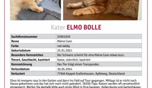 ansehenKater Elmo wird seit dem 28.04. in Allmannsweier vermisst. Er ist kastriert, hat einen Transponder und ist bei TASSO an- und als vermisst gemeldet. TASSO+49 6190 937300