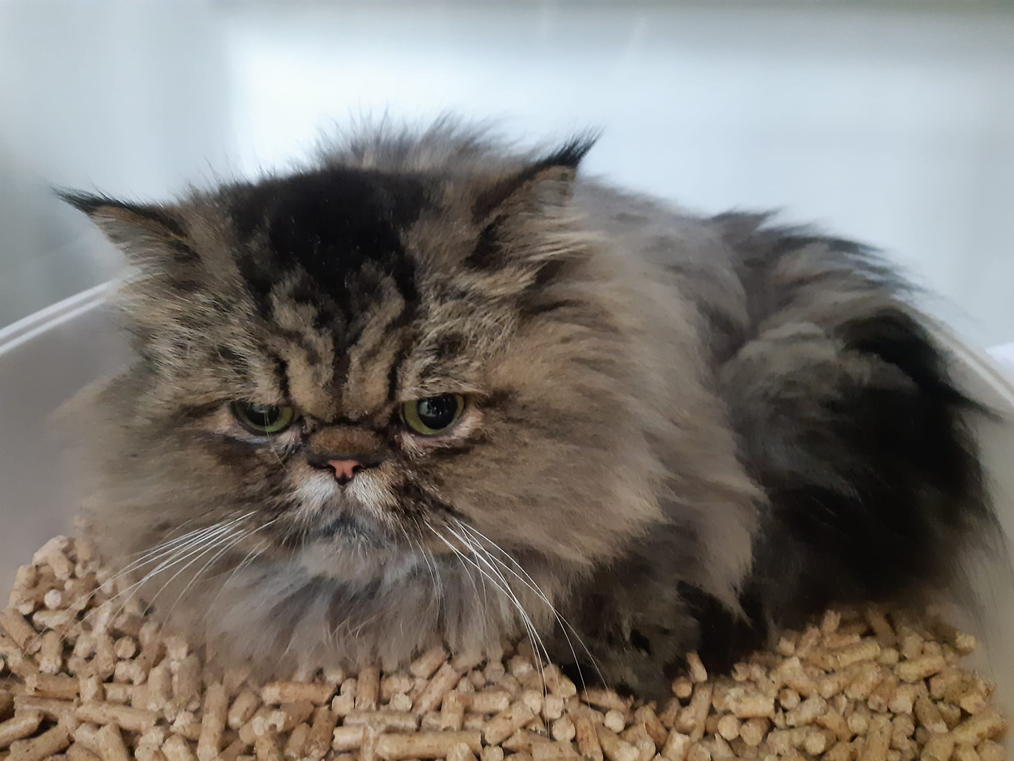 Auch wenn es auf dem Foto nicht so wirkt, ist der Pflegezustand nur als ein absolutes Grauen zu bezeichnen – die Katze besteht nur aus Filzmatten und Filzknoten.