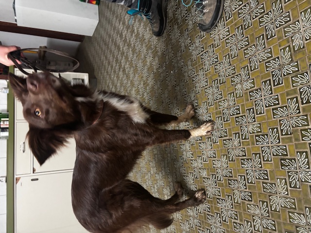 Diese braun-weiße Border Collie Hündin ist heute ihren Findern