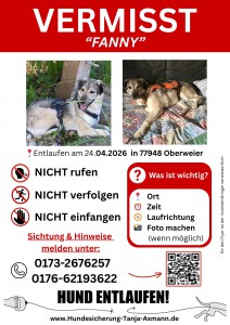 Hündin Fanny ist am 24.04.2027, in 77948 Oberweier entlaufen.