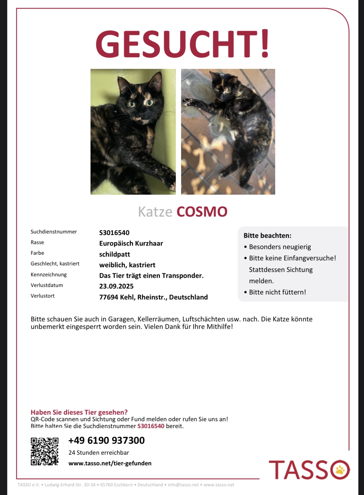 Katze Cosmo kam am 23.09.25 nicht wie gewohnt nach Hause. Seither fehlt jede Spur von ihr. Nähe Stadt/Rosengarten in 77694 Kehl. Vor circa 4 Wochen hatte sie eine Bauch-OP. Das Fell am Bauch ist noch nicht vollständig nachgewachsen.