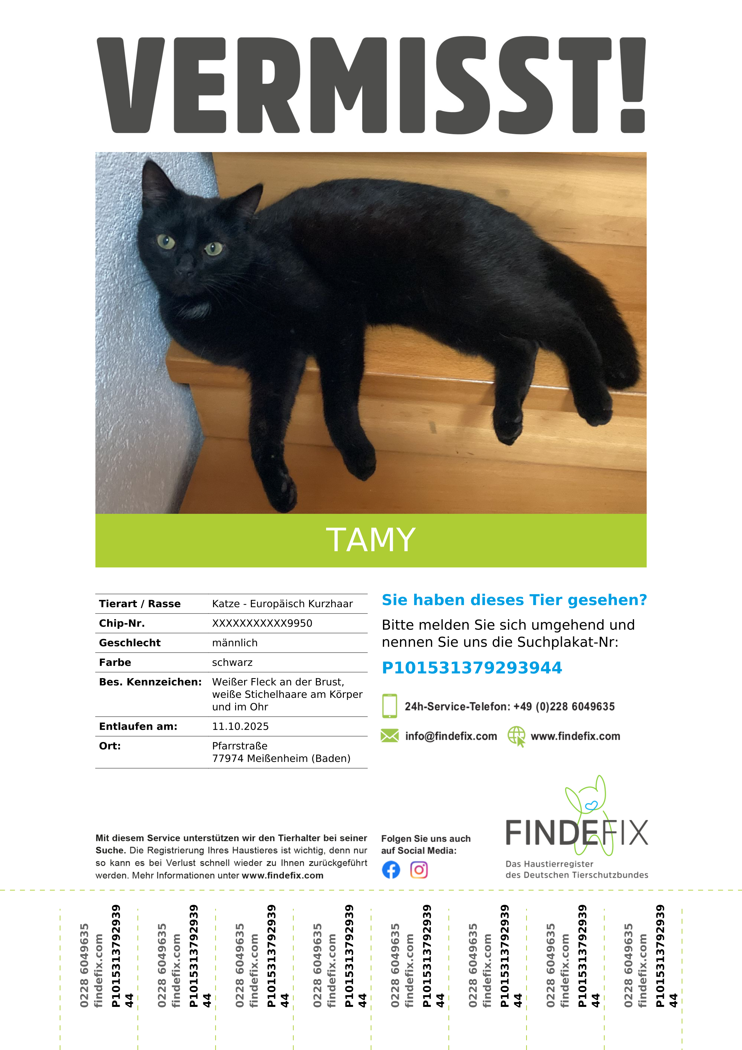 Kater Tamy wird seit dem 11.10.2025 in 77974 Meißenheim vermisst.