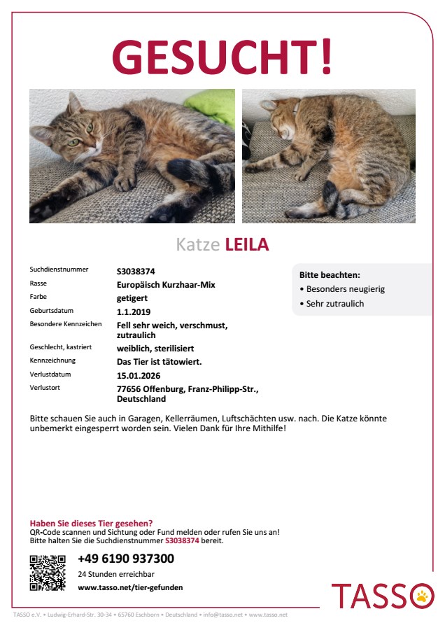 Katze Leila wird seit dem 15.01.2026 in Offenburg-Zunsweier vermisst.