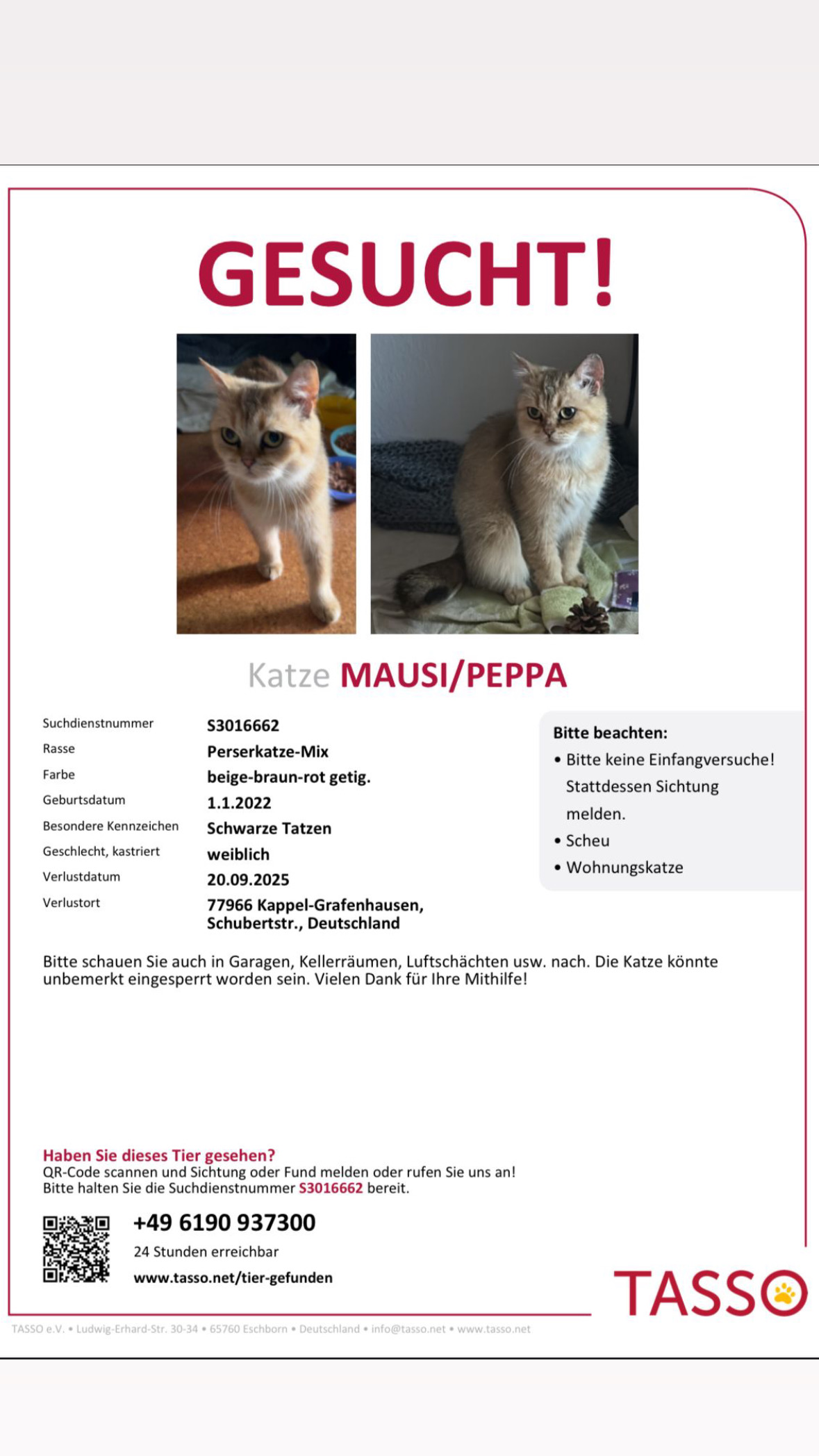 Katze Mausi/ Pepper ist am 20.09.2025 aus ihrem Zuhause in der Schubertstraße 29, 77966 Kappel-Grafenhausen entlaufen. Die Kätzin war bis dahin eine reine Wohnungskatze und erst seit zwei Wochen in ihrem neuen Zuhause. Sie hat keine Kennzeichnung, beige-braun-rotes Fell, schwarze Tatzen und eine getigerte Schwanzspitze. Wer sie gesehen oder gesichert hat, darf sich an ihre Halter wenden. Telefonnummer: 07822/7896146