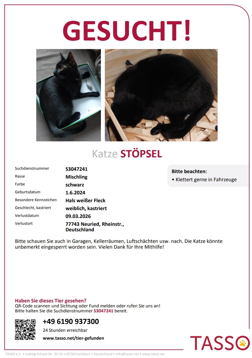 Katzendame Stöpsel wird seit dem 09.03.2026 in Ichenheim vermisst.
